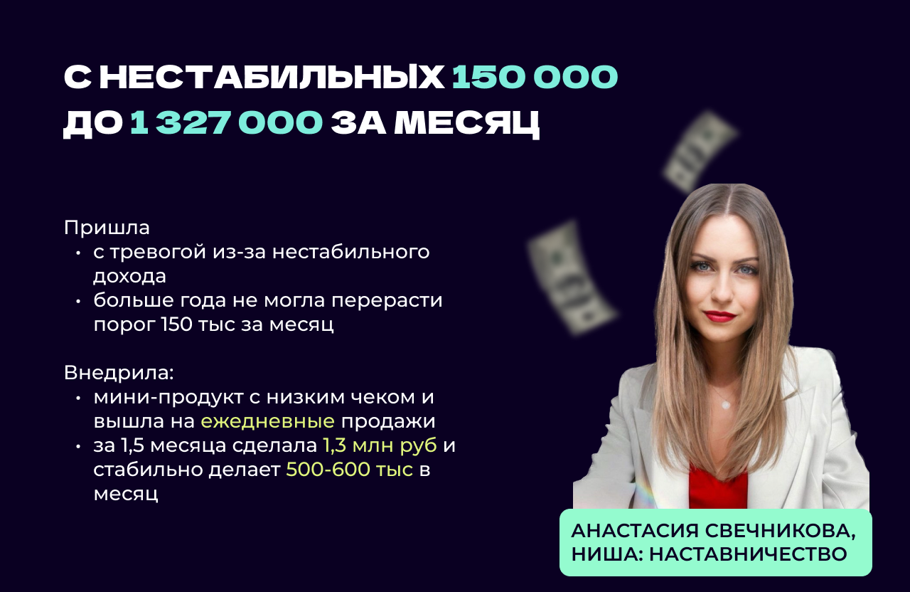 Получаешь заявки на консультации от горячих клиентов, которые купили у тебя мини-продукт. Закрываешь 5 из 10 в покупку наставничества